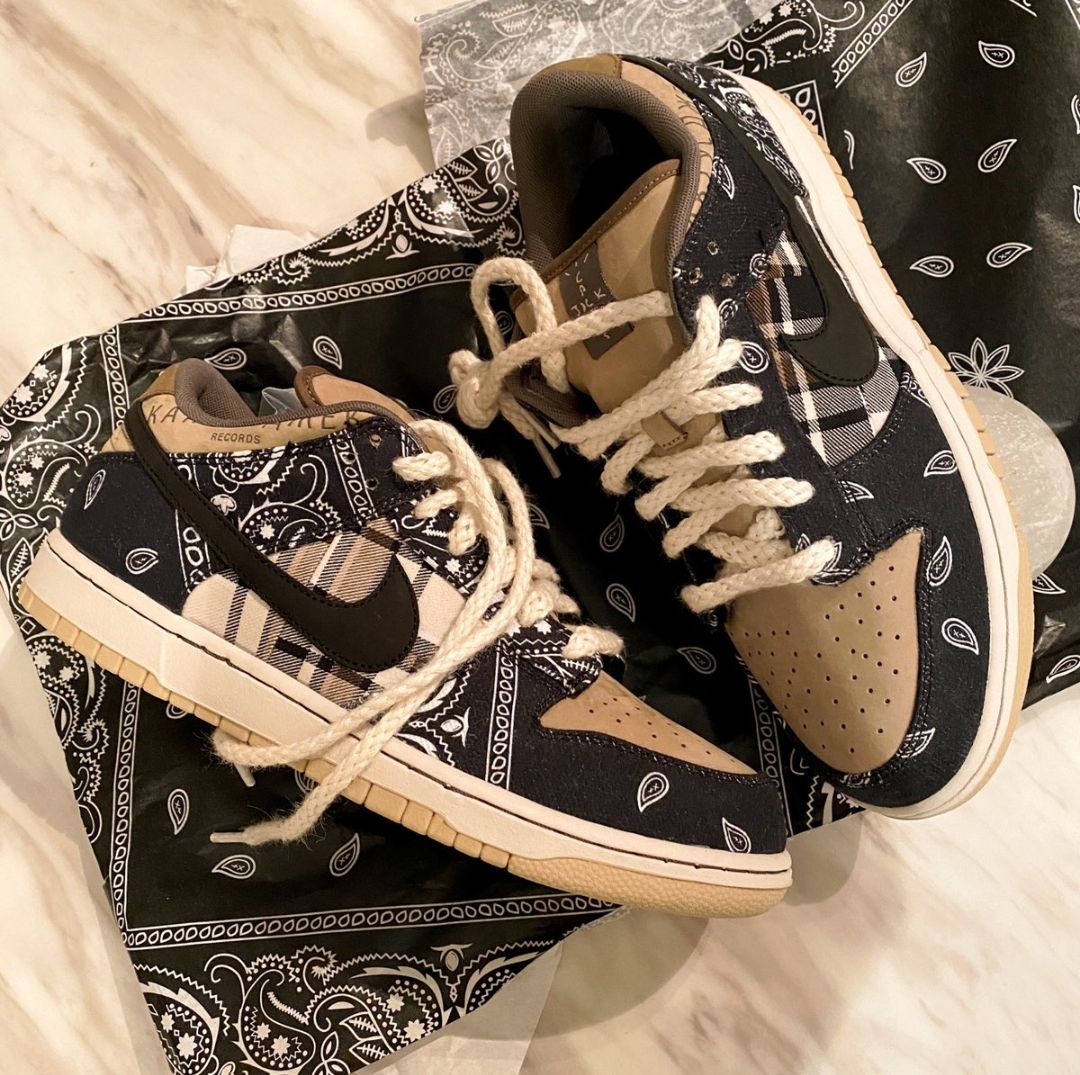 The Travis Scott x Nike SB Dunk Low is the rap superstar’s first collaboration with Nike’s skate imprint on the revered Dunk model. Scott, a fan and collector of coveted Dunks from the shoe's mid-aughts heyday, previously teased his Nike SB collaboration during his “JACKBOYS” video and quickly put the sneaker world on notice. Dark navy blue paisley panels along the heel and forefoot contrast the plaid pattern found on the mid-panel and perforated khaki toe. Each shoe has dusty pink and black Swooshes on opposite sides of the upper. Scott opts for extra wide white rope laces and signature “Cactus Jack” branding on the tongue. A white midsole and tan-colored outsole complete Scott's unique take on the classic skate shoe. Release date: February 29, 2020.